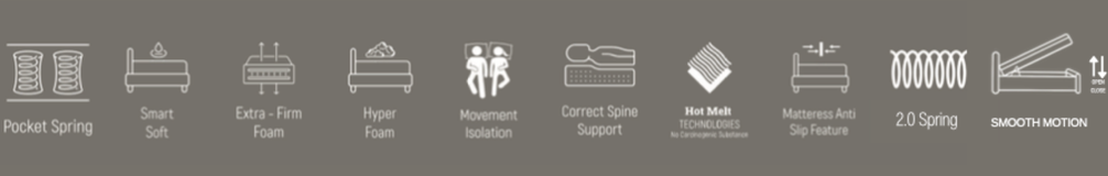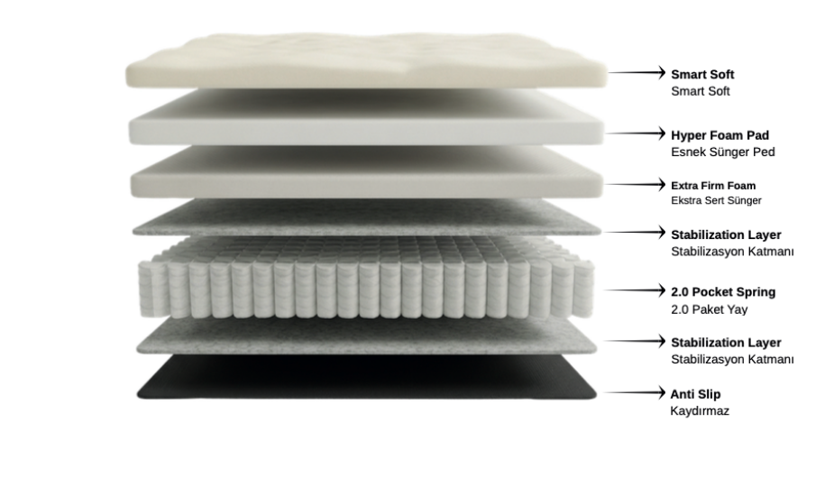 2.0 YayEkstra Sert Konfor SüngeriHareket İzolasyonuHot Melt TeknolojisiHyper Foam SüngerKaymaz YüzeyOmurga DesteğiPaket Yay SistemiSmart Soft Sünger