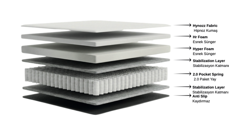 2.0 YayHareket İzolasyonuHot Melt TeknolojisiHR SüngerHyper Foam SüngerKaymaz YüzeyOmurga DesteğiPaket Yay Sistemi